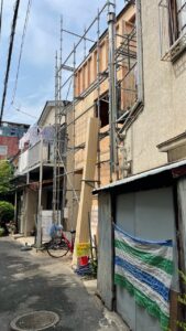 荒川区の狭小地(約13坪)に木造3階建の建て方作業を行いました。