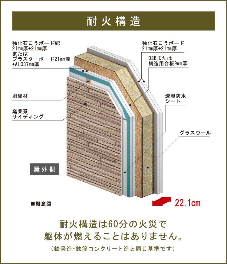 防火地域に建てられる『耐火構造』の建物は、法律上「60分間の火災に耐えられる仕様」が義務づけられています。