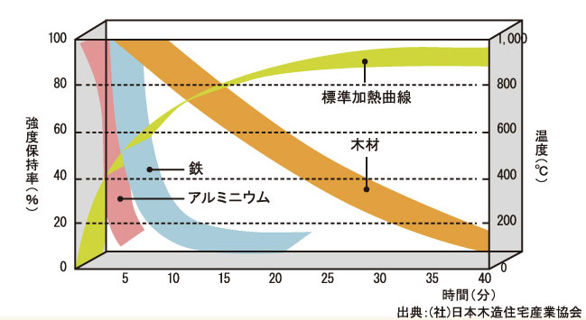 上図のように、鉄やアルミニウムが加熱開始後の数分間に急激に強度が低下しているのに対し、木は徐々に強度が低下している事が分かります。これは、鉄やアルミニウムが火災によってグニャリと曲がってしまうのに、木は構造物としての形を維持し続けていることを意味します。
